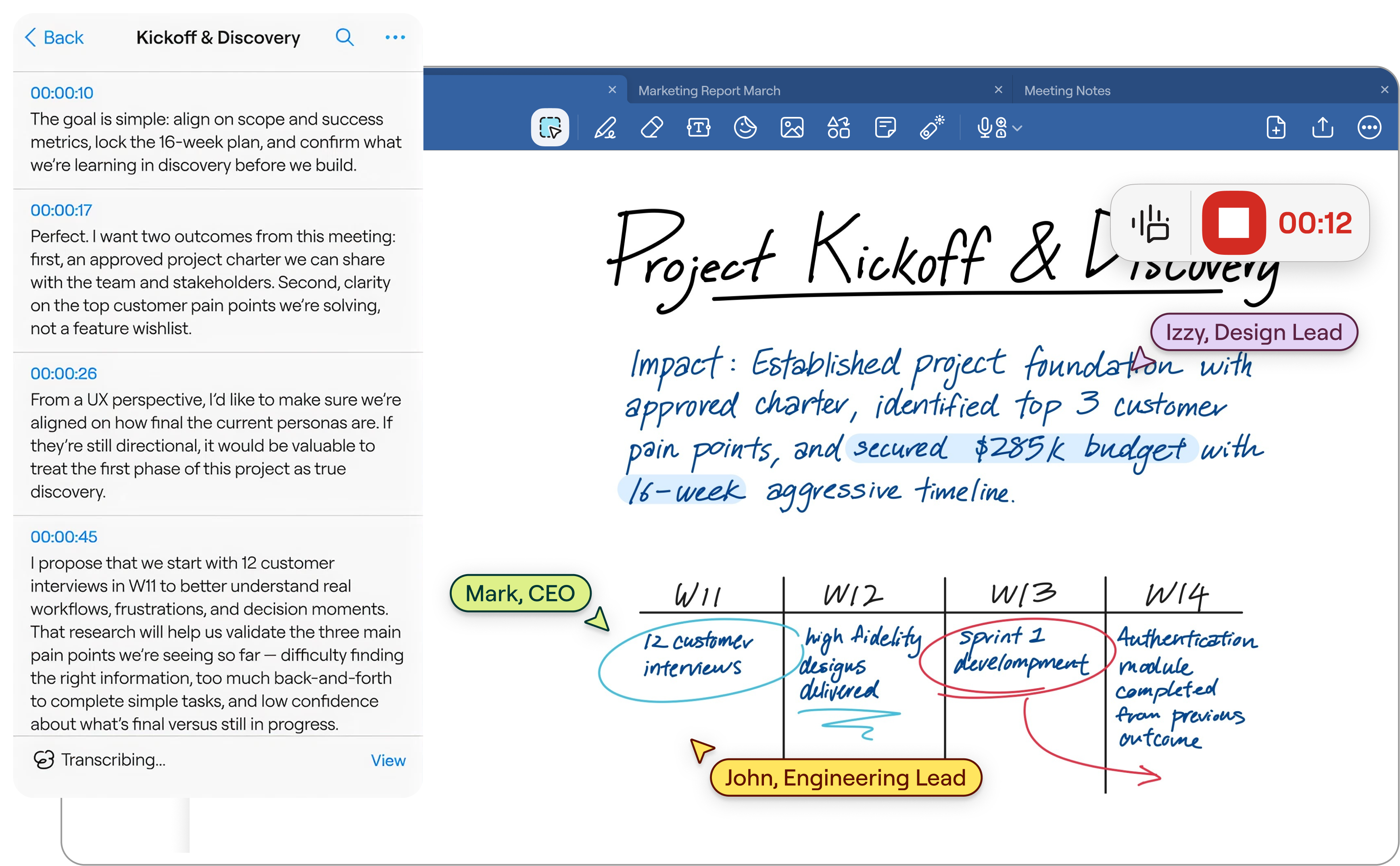 Tap anywhere on your handwritten notes to jump the audio to that exact moment. Perfect for reviewing complex technical details or clarifying vague action items.