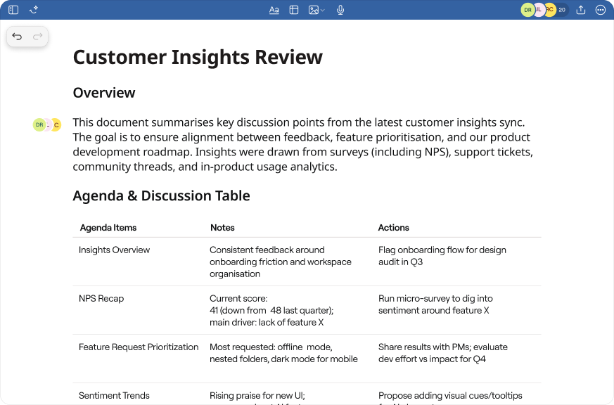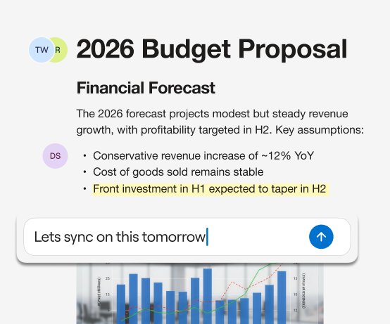 Write together in real time or on your own schedule. See updates instantly across devices, keep discussions tied to the content, and move faster without workflow friction.