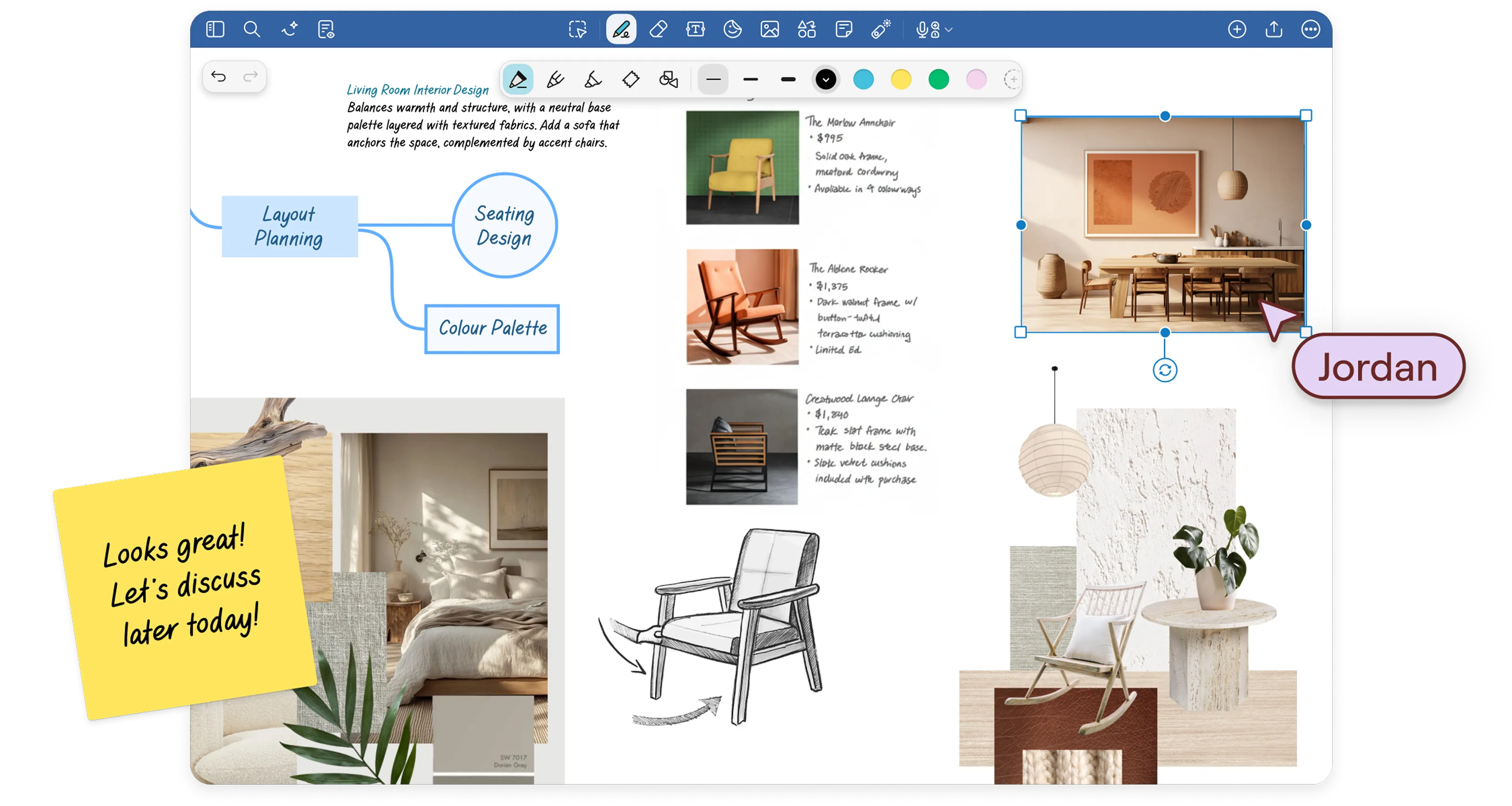 Work through design changes, site constraints, and project decisions in one shared digital whiteboard, keeping sketches, markups, and logistics connected from ideation to build.