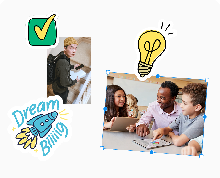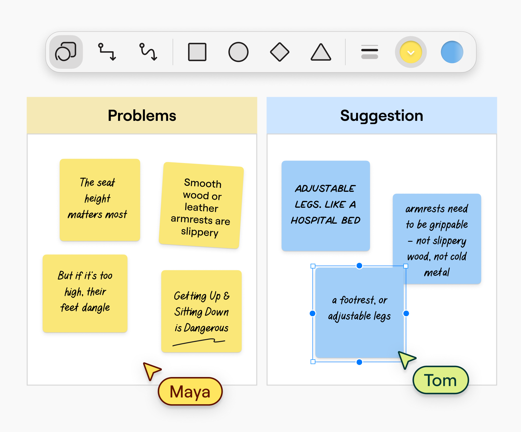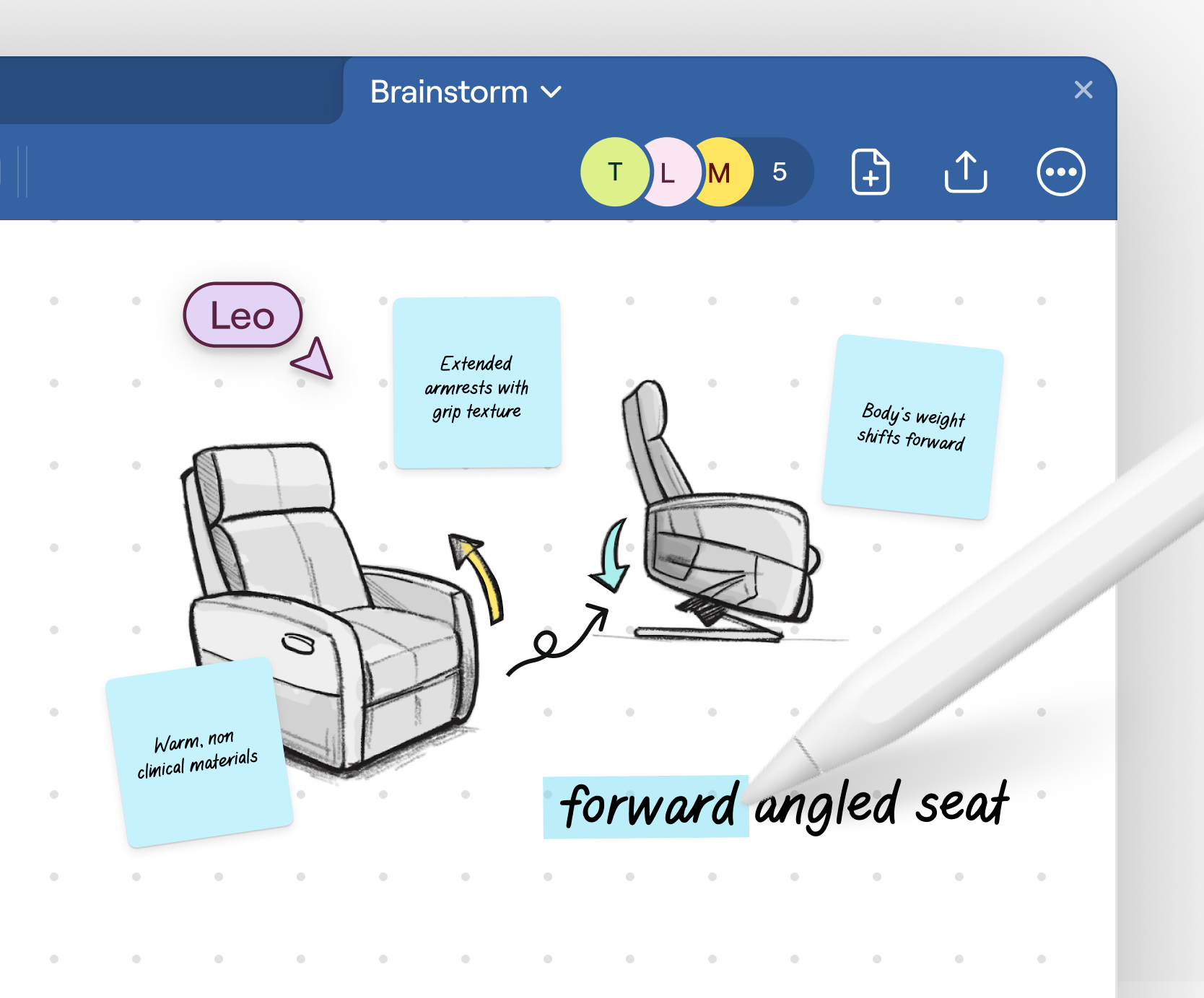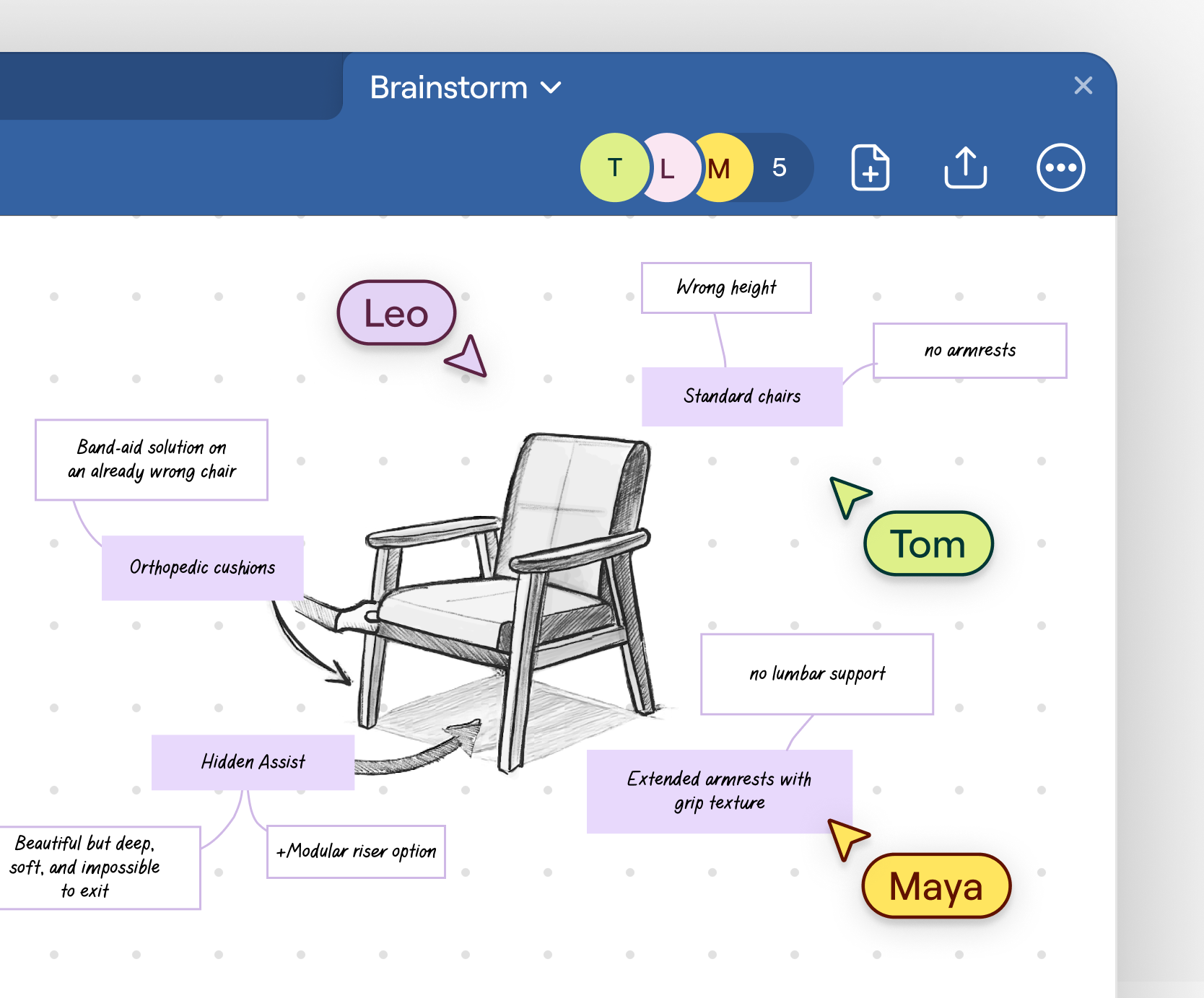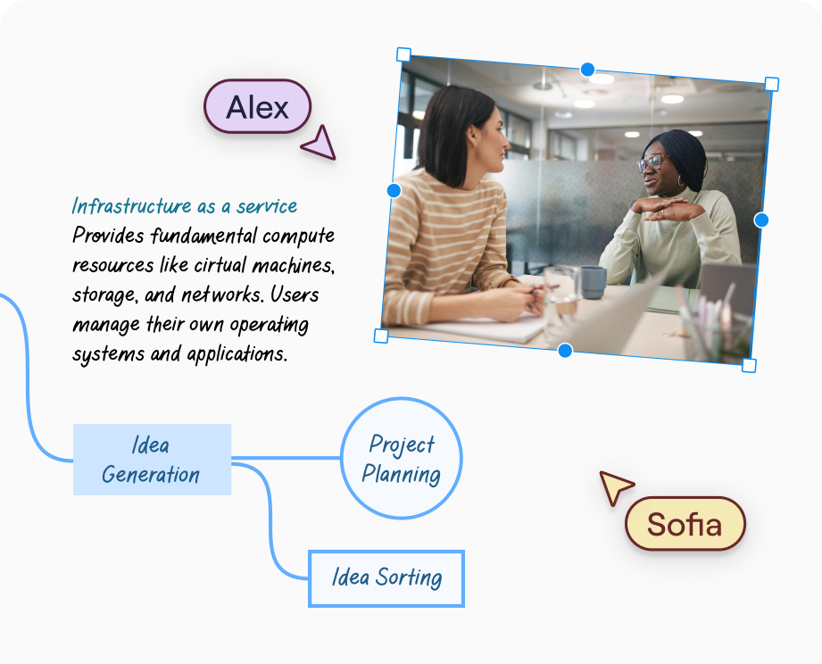 Collaborate on the same canvas to react, refine, and combine ideas as you go. Instead of passing files back and forth, you move toward alignment together.